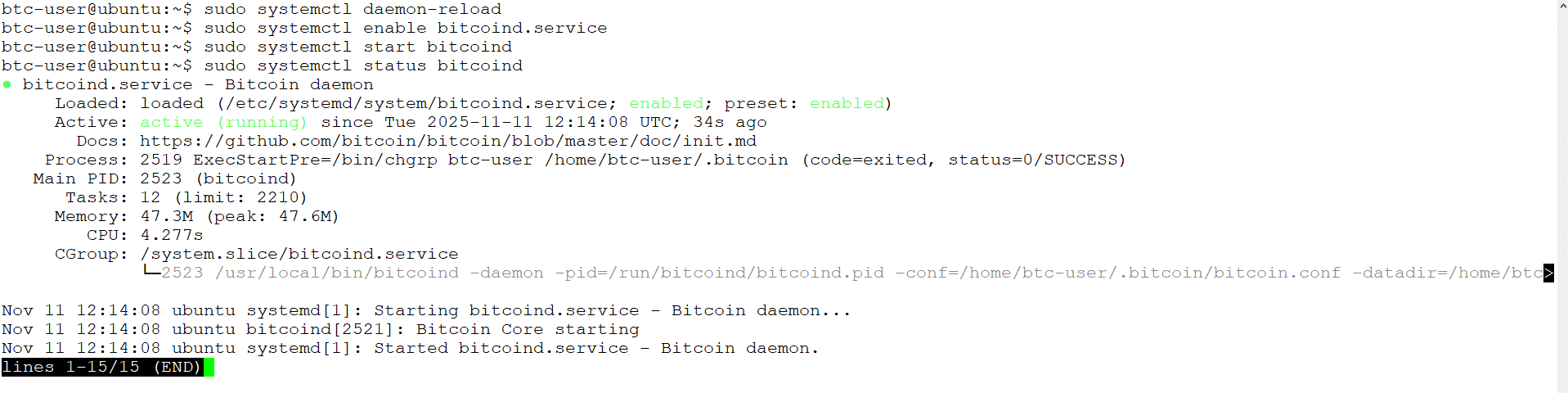 Наконец, убедитесь, что ваш узел Bitcoin работает правильно, проверив его статус обслуживания: