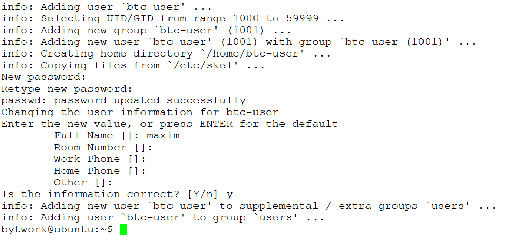 Затем создайте нового пользователя для запуска Bitcoin Core: