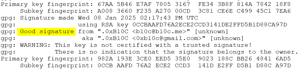Успешная верификация отобразит сообщение о «хорошей подписи» (good signature) от разработчика Bitcoin Core.