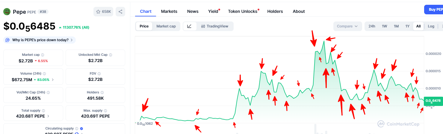 Динамика цен Pepe определяется не столько фундаментальными факторами, сколько поведенческими циклами ликвидности, циклами обратной связи, обусловленными настроениями розничных продавцов, мем-культурой и краткосрочными торговыми потоками.