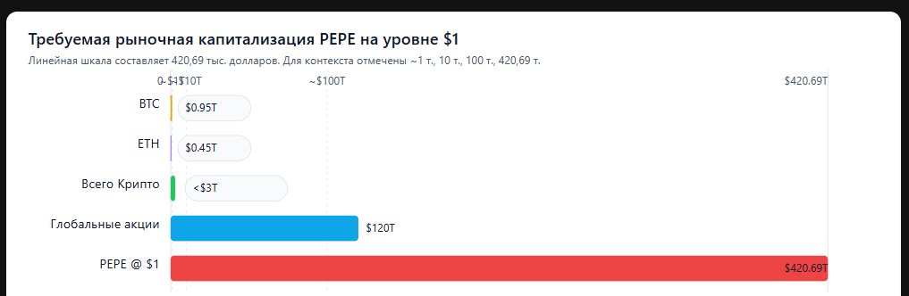 - Расчет 1 PEPE по 1 доллару: 420,69 Т × 1 доллар = 420,69 триллиона долларов рыночной капитализации - примерно в 4 раза больше мирового рынка акций.