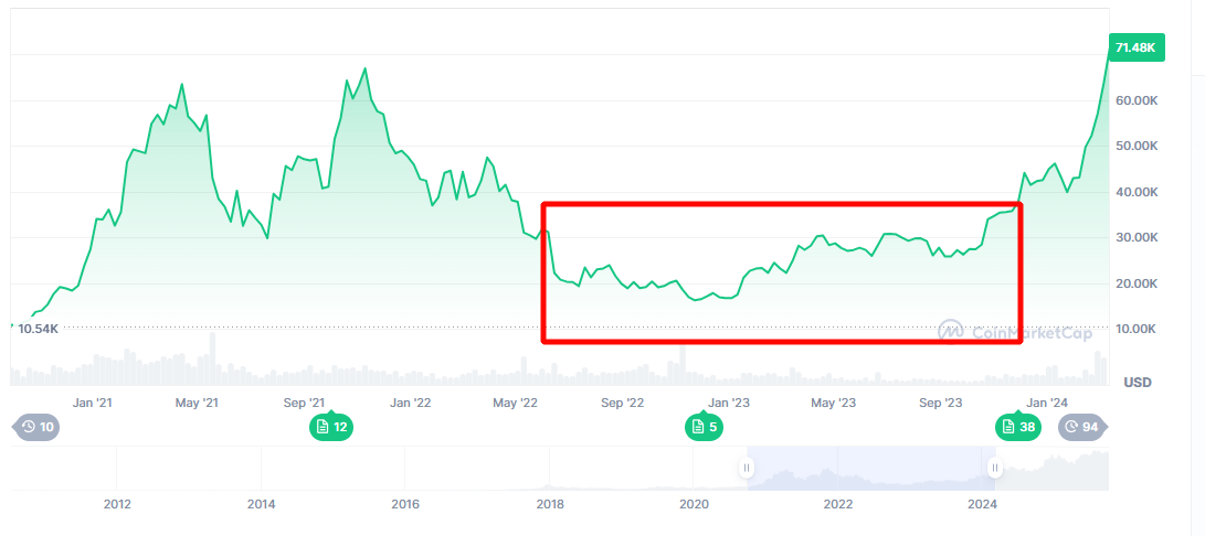 Биткоин находится в середине цикла после халвинга, и интерес к нему со стороны институциональных инвесторов возобновился.