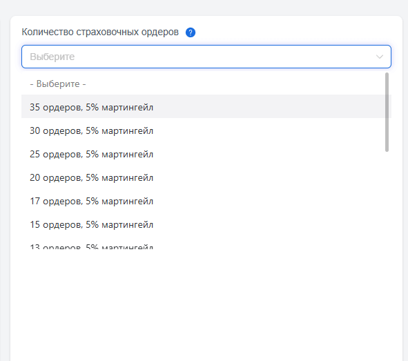 Далее Вам нужно выбрать количество страховочных ордеров. ВАЖНО: депозита должно хватать для создания всей сетки ордеров сразу либо, либо, если вы не хотите, чтобы бот создал на бирже сразу всю сетку ордеров, то включите ниже функцию частичного выставления сетки ордеров.