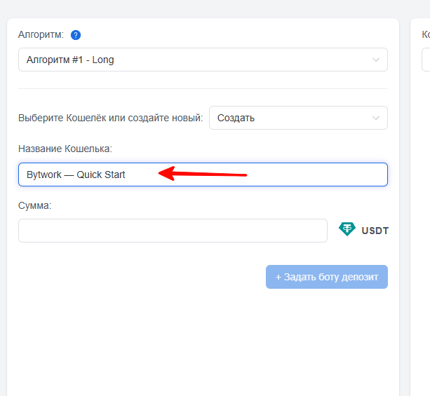 Далее Вам нужно указать сумму, которой бот будет распоряжаться, к примеру, 500 USDT.