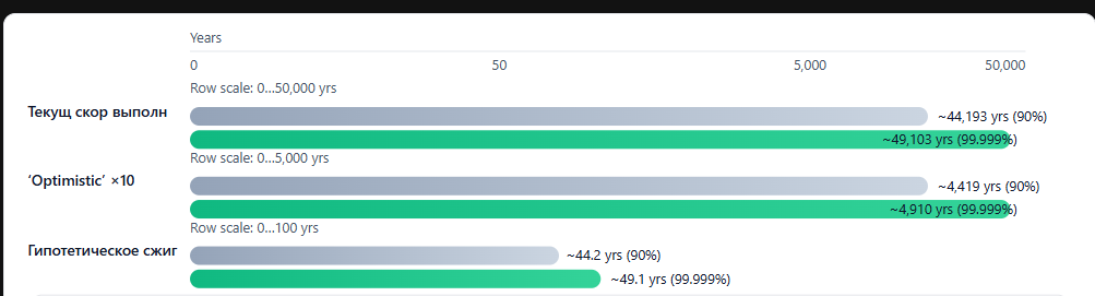 Вывод: даже при десятикратном ускорении темпа от сегодняшнего, 90% займут тысячелетия, а 99,999% - ещё дольше. Только экстремальная скорость сжигания сжимает временные рамки до десятилетий.