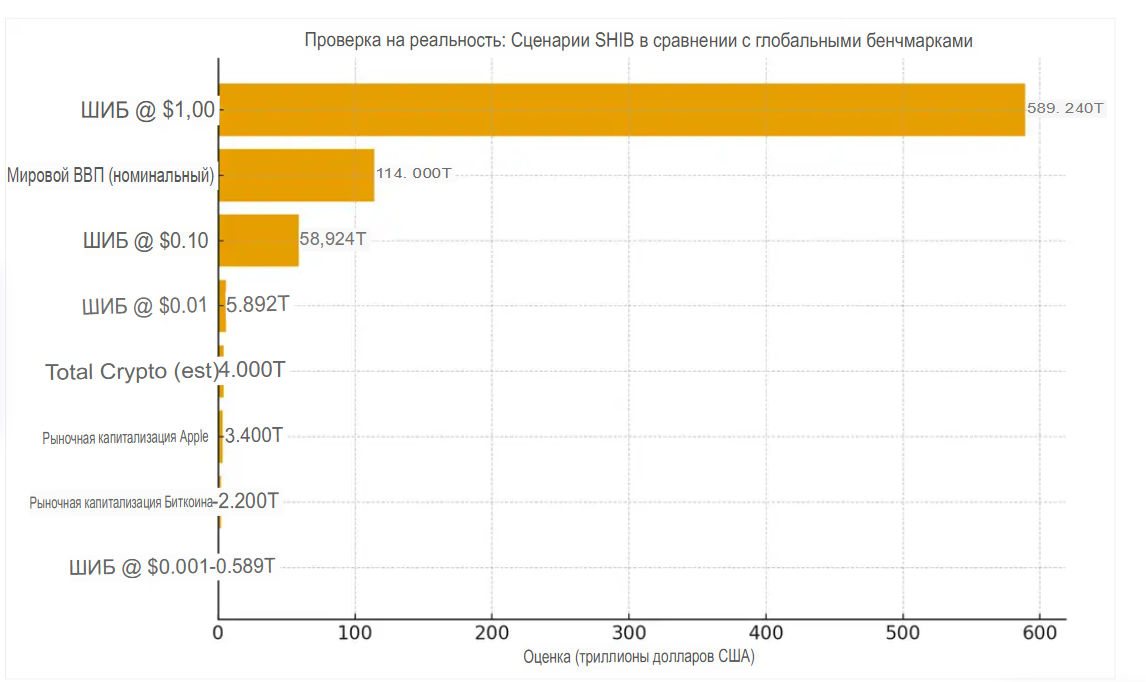 При цене около ~0,000012-0,000013$ и рыночной капитализации ~7-8 млрд долларов, 1$ за 1 монету SHIB подразумевает оценку примерно в ~ 589 триллионов долларов (капитализации), что на намного больше всего рынка криптовалют и примерно в пять раз превышает мировой ВВП.