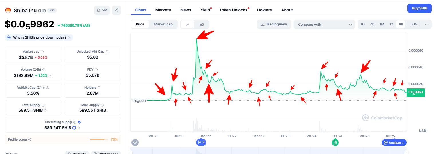 При объёме эмиссии около 589,24 триллиона токенов даже незначительные изменения цены резко увеличивают цену SHIB.