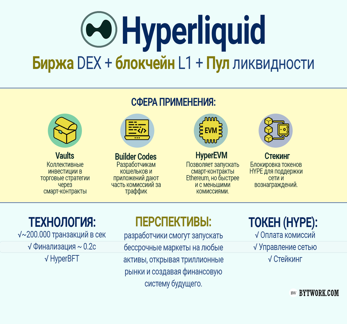 Hyperliquid - это высокопроизводительная децентрализованная биржа с собственным блокчейном первого уровня (Layer 1), созданная для объединения лучших черт централизованных бирж, таких как Bybit, и децентрализованных бирж, таких как Uniswap.