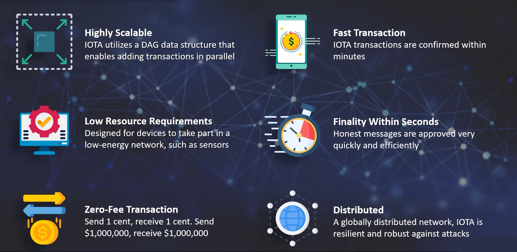 IOTA довольно перспективная монета, так как предлагает новый механизм распределенных регистров Tangle, благодаря которому транзакции происходят бесплатно и подтверждаются каждым участником сети.