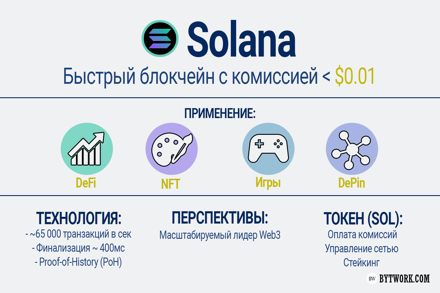 Благодаря скорости и низким комиссиям, Solana обеспечивает быструю и масштабируемую работу децентрализованных приложений, таких как DeFi, NFT и игры.