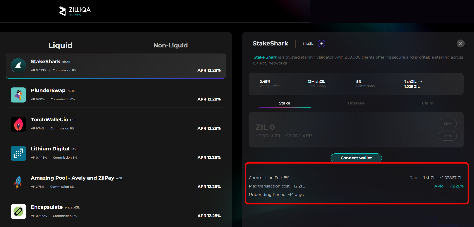 В стекинге вы делегируете свои монеты ZIL одному из пулов валидаторов, таких как StakeShark или PlunderSwap. Взамен вы получаете вознаграждение в виде дополнительных монет ZIL. Указанная годовая процентная ставка (APR) составляет примерно 12.28%. Это ваш способ получать пассивный доход.