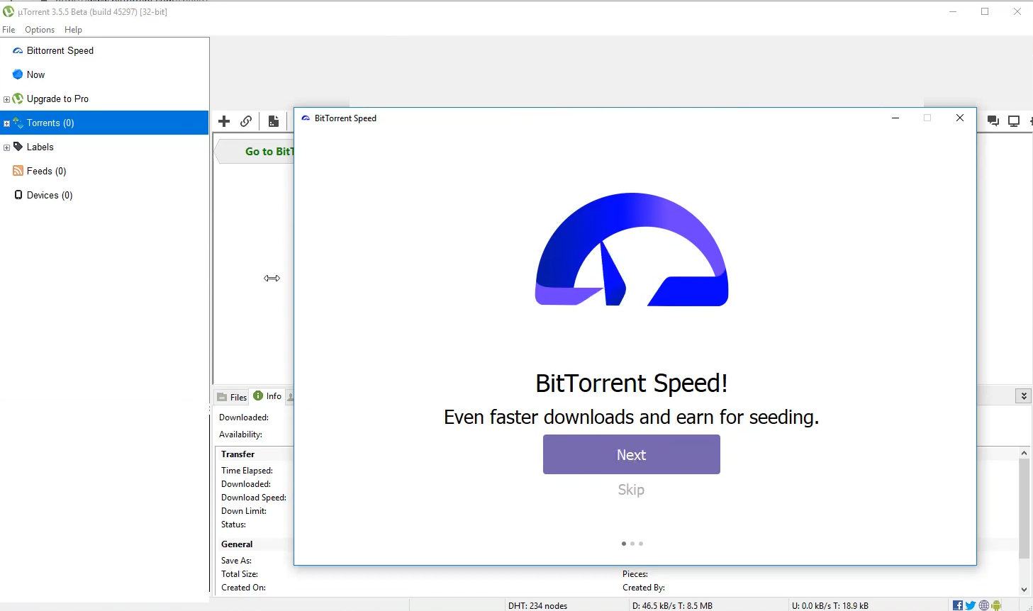 You can receive the BTT token for seeding files to other users after you have downloaded them yourself. The longer and more stable you seed, the more you can earn. For this, you need one of the latest versions of the μTorrent or BitTorrent Classic clients. In the program settings, you need to find and activate the BitTorrent Speed function.