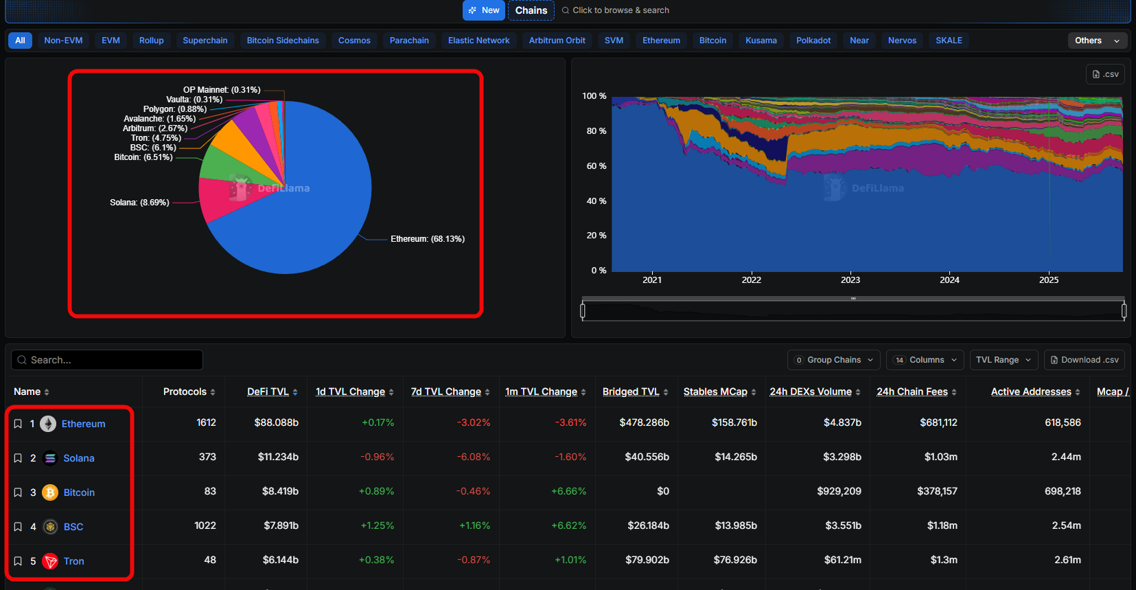 DefiLlama ranks chains by TVL size. You can quickly switch between chains at the top