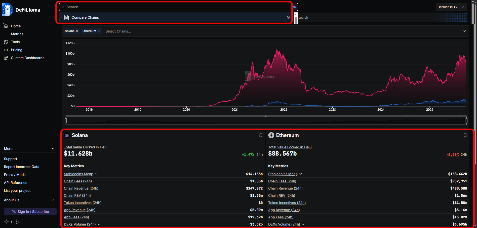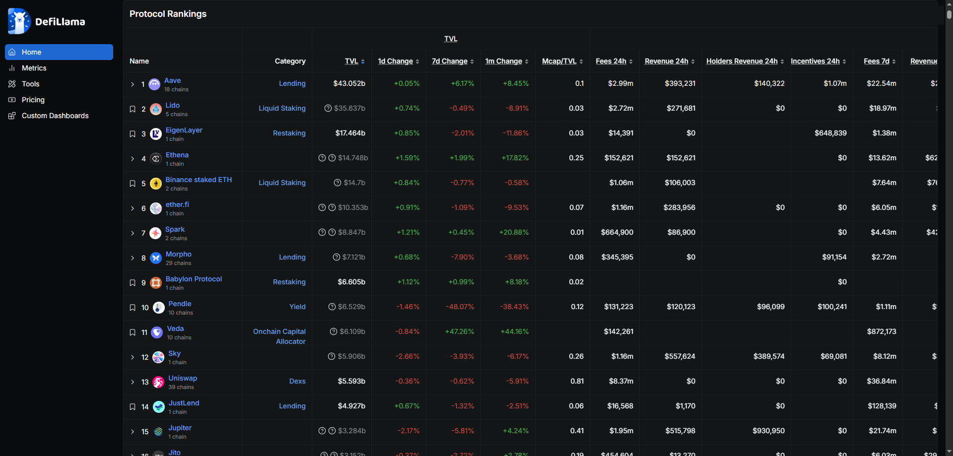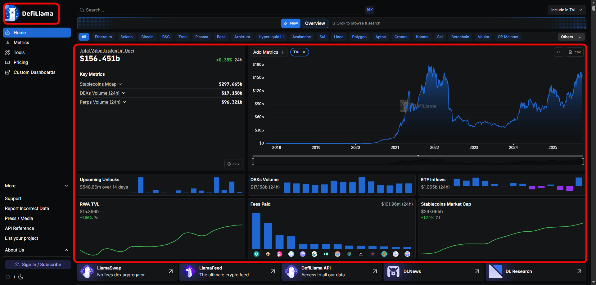DefiLlama offers a whole range of metrics. Let's look at the most useful ones.