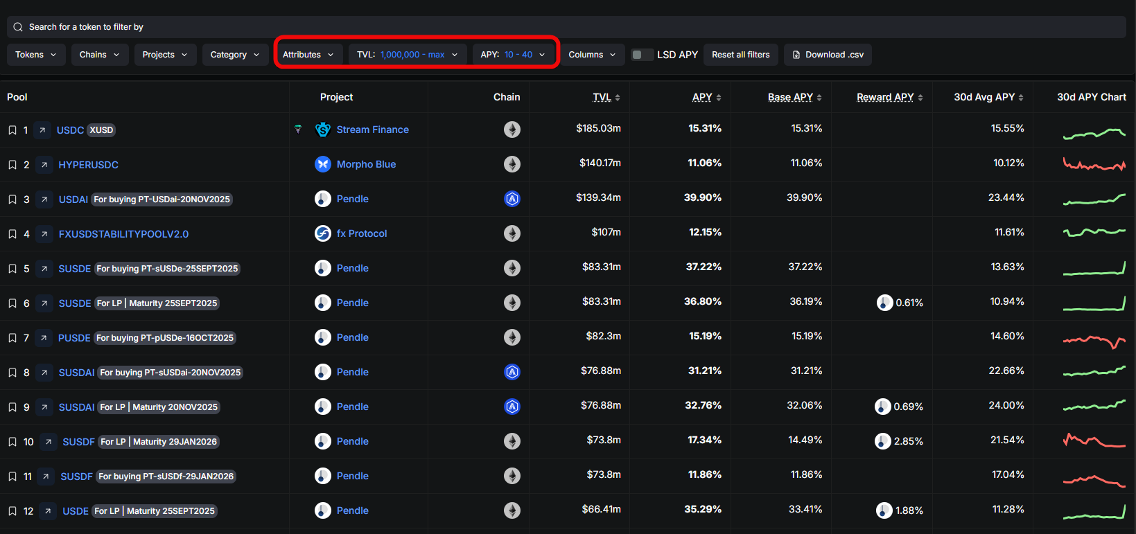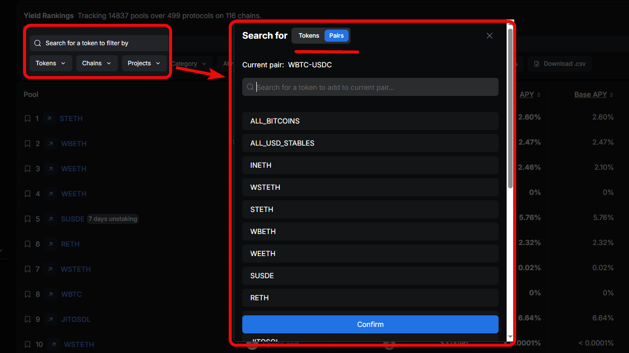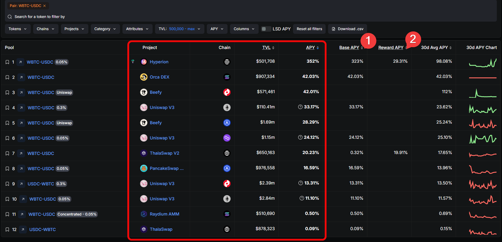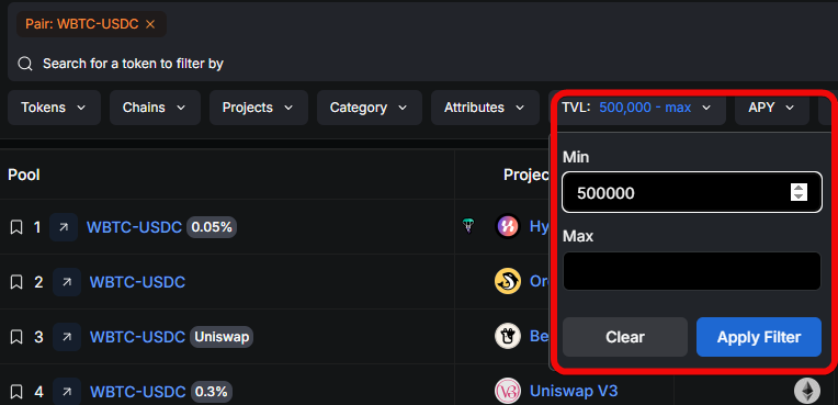 You can specify a particular pair, for example, WBTC/USDC, and set a TVL filter from $500k, then sort by APY.