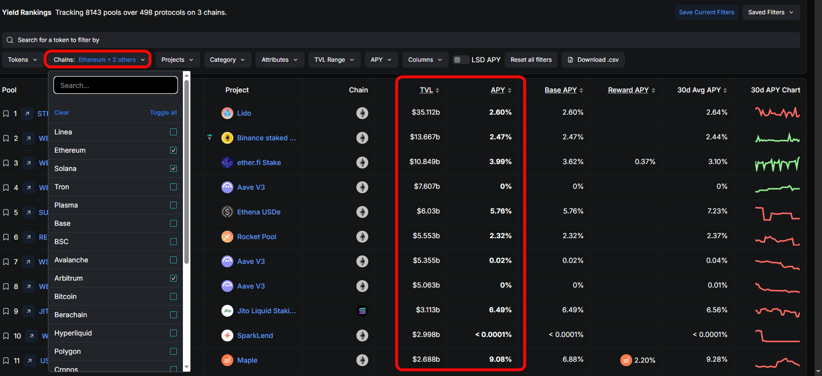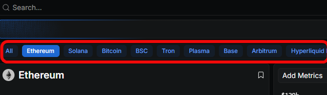 Experienced investors also search for protocols through attributes. First, they select a chain – Ethereum, Arbitrum, Solana – and keep one or several to reduce noise.