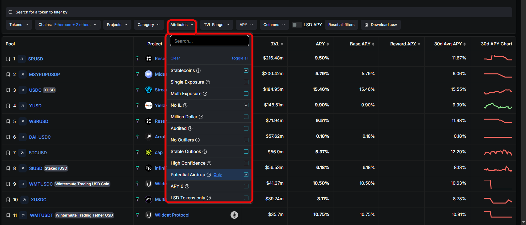 filter and specify stablecoins, pools without impermanent loss, or potential airdrops.