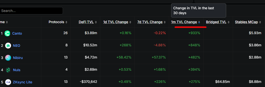 Here you can also see how funds are moving between blockchains. If you need to know which network attracted the most TVL in the last month, you can view and filter out small projects with a couple million dollars.