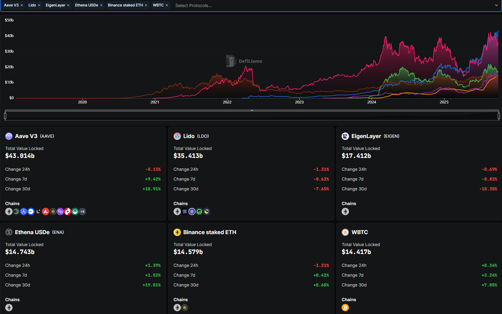 You can also compare protocols themselves. You can plot the TVL and compare daily, 7-day, and 30-day changes. In the example, we compared the protocols Aave, Lido, EigenLayer, Ethena USDe, Binance staked ETH, and WBTC.