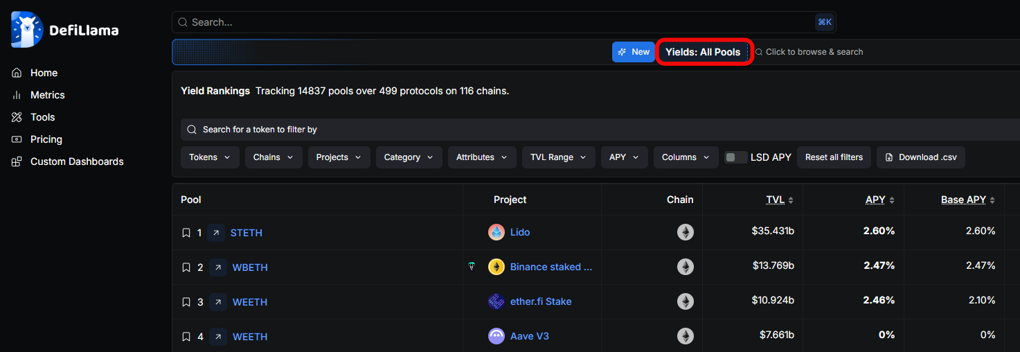 DefiLlama is a kind of encyclopedia, showing liquidity, fees, revenue, and transaction volumes across thousands of protocols. In this sense, DefiLlama is like a crystal ball, displaying the best yields across the entire DeFi space in real-time.