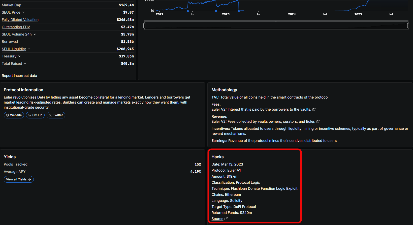 If you open a specific protocol, its hack history will also be shown at the bottom.