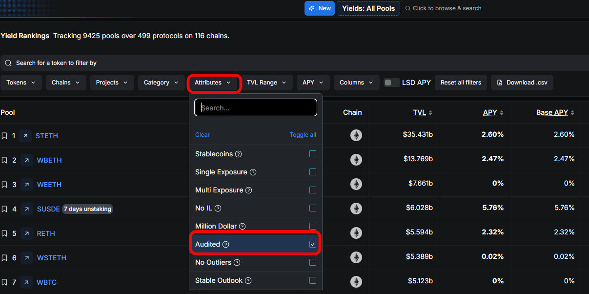 If you apply DefiLlama filters by TVL, asset type, and chain, you can quickly cut through the noise and focus on protocols that have already proven themselves as sustainable. This helps reduce the risk of falling for a scam or entering a low-liquidity pool.