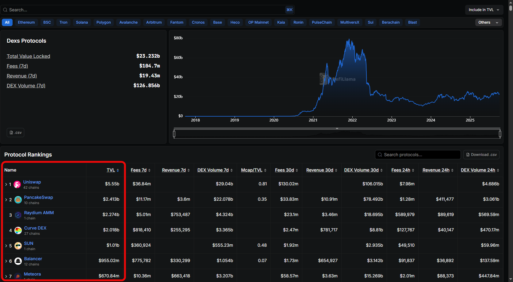 Decentralized exchanges allow you to swap crypto directly between users, and DefiLlama tracks DEX volumes.