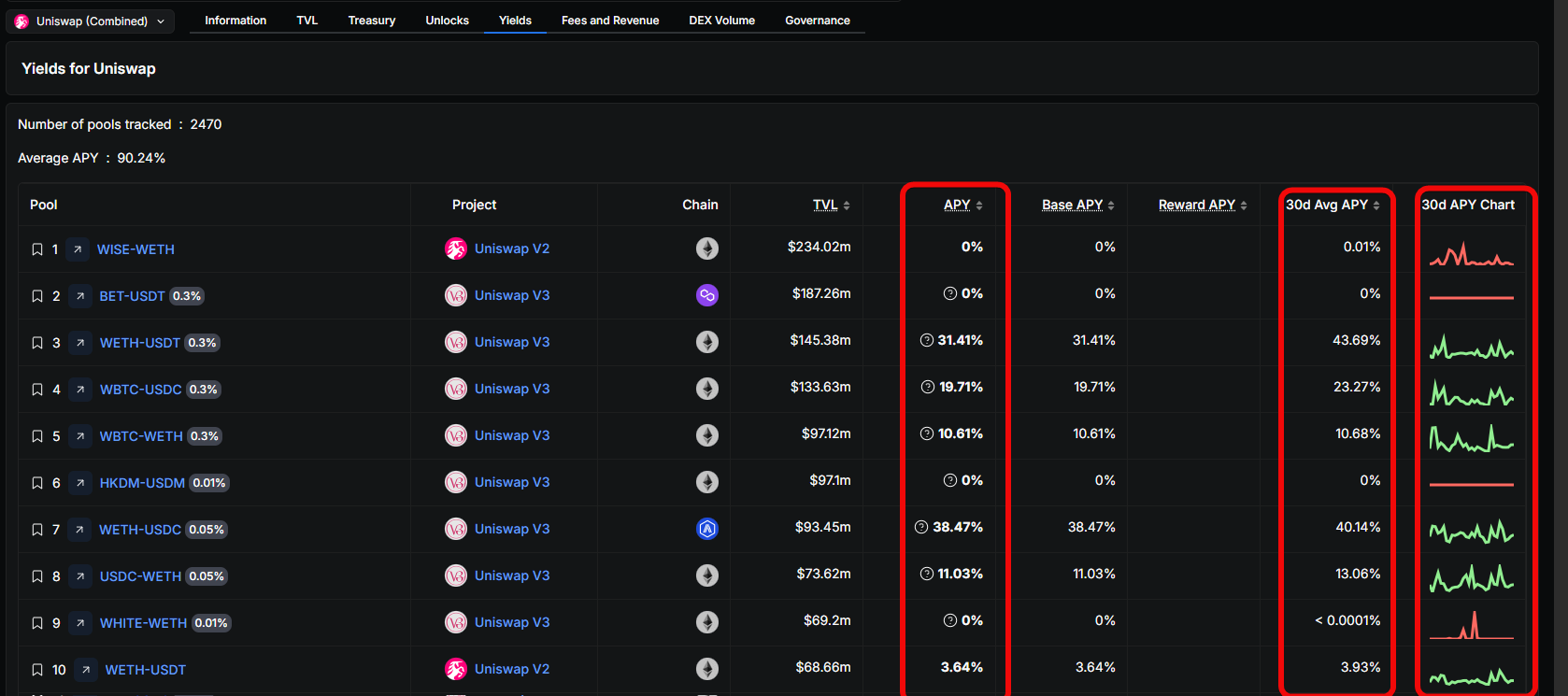 Uniswap leads, gathering $106 billion daily. Clicking on this protocol, we see its yield. This includes the average 30-day yield and a chart. APY