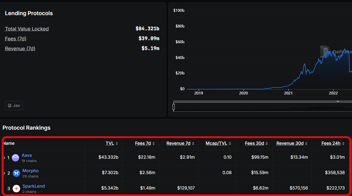, where first place is taken by AAVE with $43 billion, second by Morpho with $7.3 billion.