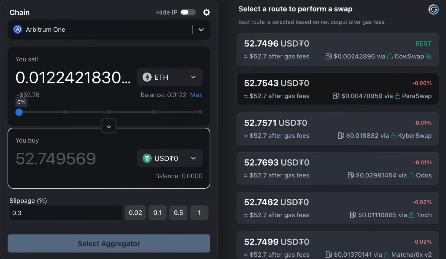 ) and get a route that considers the exchange rate and fees from third-party protocols.