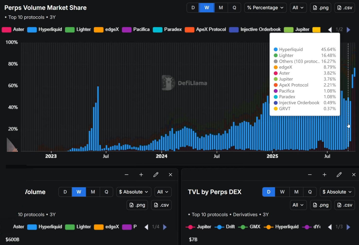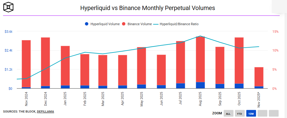 And although it's still far from Binance's metrics, we are observing Hyperliquid gradually eating into the centralized monopolist's market share.