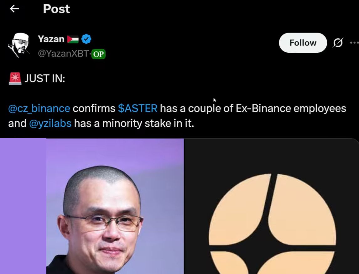 The situation with Aster is complicated: technically, it's not Binance, but the ties are very close – Binance's founder (CZ) actively promotes the platform on social media and confirms the participation of former Binance employees.
