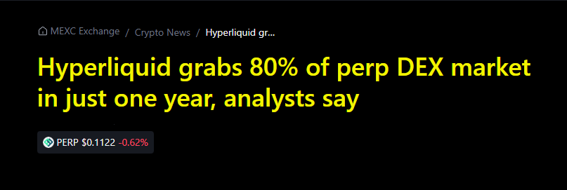 In its first cycle, Hyperliquid is already the undisputed leader in its segment with a market share of approximately 80% of DEX trading.