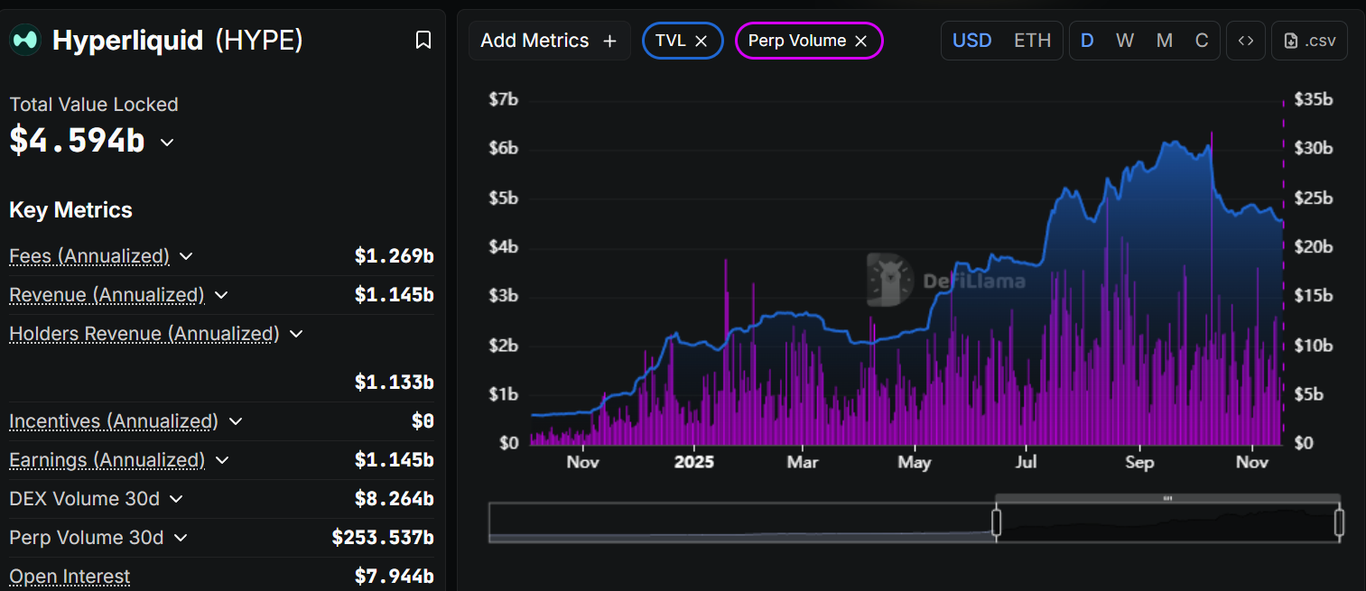 Hyperliquid also leads among perpetual contract exchanges, surpassing DEXs like Jupiter, Aster, and edgeX.