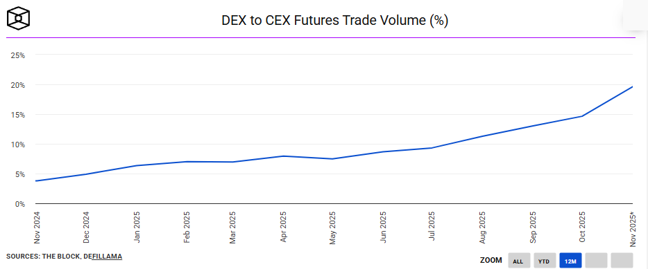The result is that Hyperliquid is both the cause and the beneficiary of this trend. The share of DeFi derivative trading has grown from less than 3% to over 20%, whereas previously, even in a bull market, it hovered around 1-4%.
