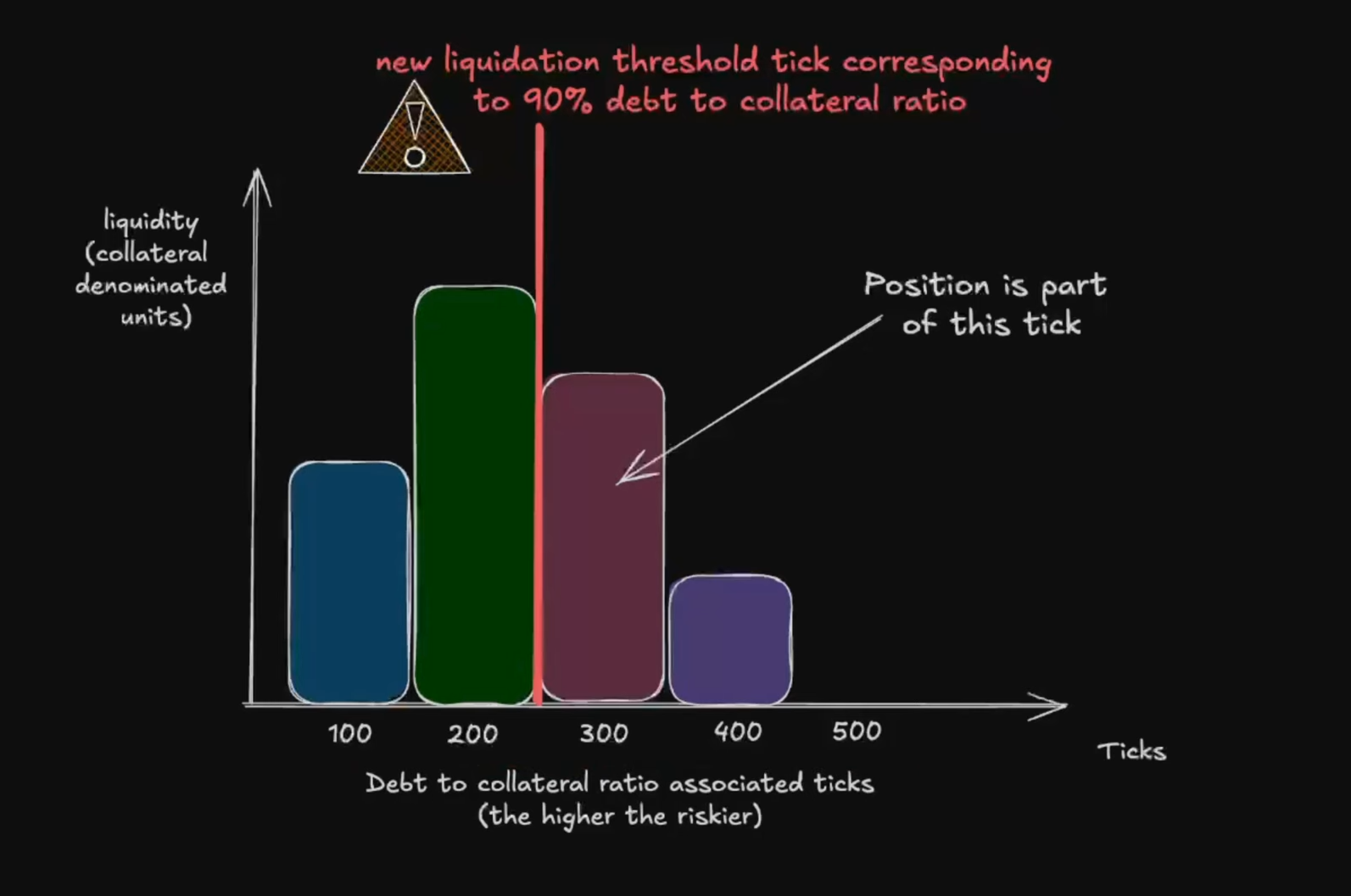 Here, all positions in the protocol are sorted into shelves (ticks). Each shelf is a risk level. Instead of liquidating each position individually, the system takes the entire risky tick and repays the minimally necessary portion of collateral from it to return that tick to the safe zone.