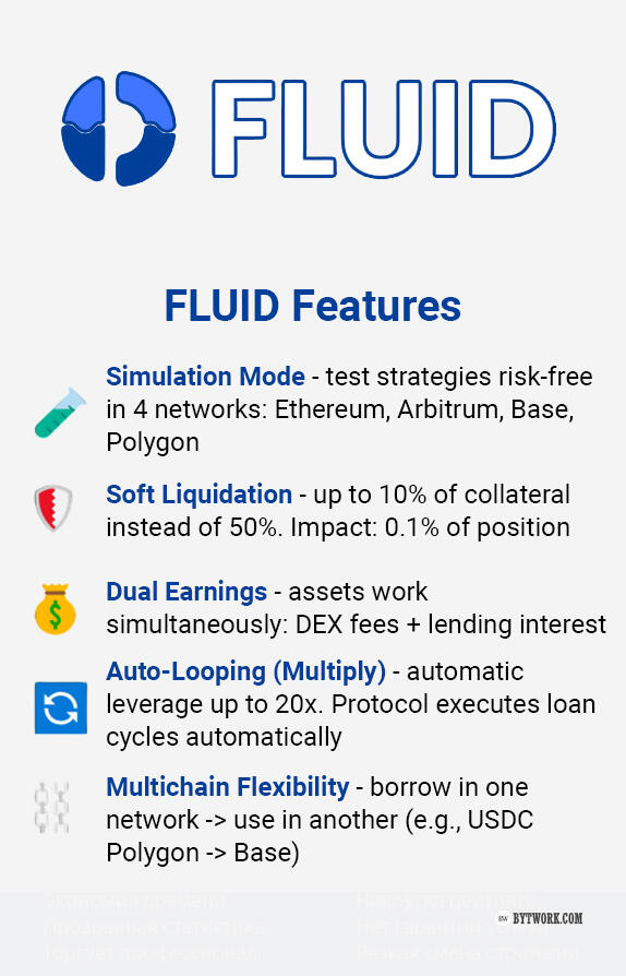 Fluid also uses an advanced oracle system, combining Chainlink data and Uniswap's Time-Weighted Average Prices (TWAP). 3 checkpoints are compared with the current price on Uniswap to exclude manipulation and ensure maximum accuracy.