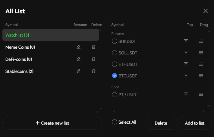 Almost all exchanges have only one Favorites tab, but Phemex allows you to create any number of personal watchlists, name them, or drag coins across folders.