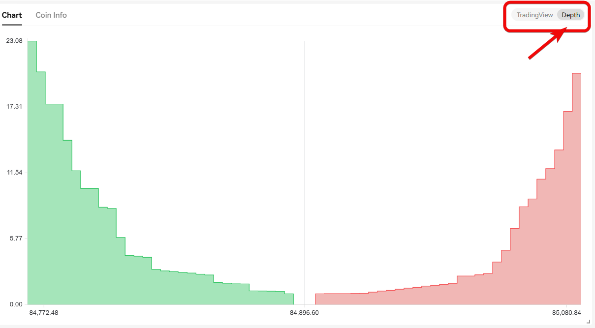 You can also view the order book depth for buy and sell orders on the chart.