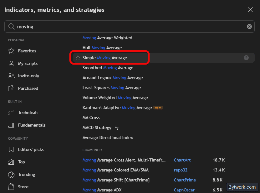 To add a moving average to a chart in TradingView, click on Indicators at the top of the screen and search for moving average. Options for Simple Moving Average (SMA) and Exponential Moving Average (EMA) will appear. Add your preferred indicators to your favorites so they are always accessible in the Favorites tab.