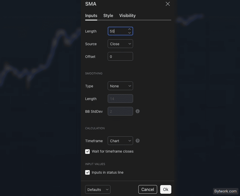 After adding, open the settings by clicking the gear icon and go to the Inputs tab. Here, select the period for each average. Instead of the rarely used period 9, we recommend considering values like 50, 100, and 200. The 50-period acts as a short-term trend indicator, 100 as medium-term, and 200 as long-term.