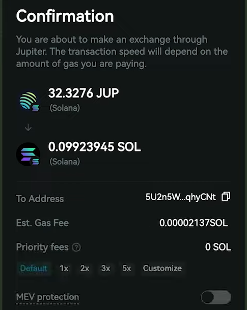 Est. Gas Fee– this is the fixed network fee for executing any operation.Priority Fee– this is an extra payment to make the transaction go faster.MEV Protection– this is protection against bots that intercept swap deals and insert unfavorable rates. It's better to always enable this option.