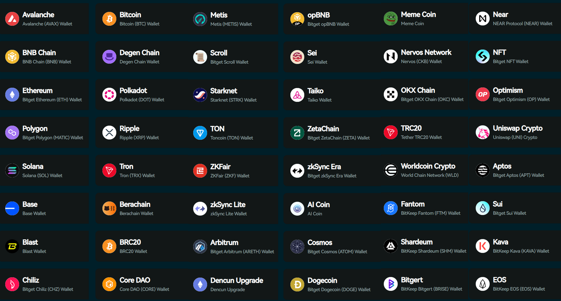 The Bitget Wallet supports over 130 networks and more than 1 million cryptocurrencies, including Bitcoin, Ethereum, BNB Chain, Polygon, TRON, Solana, and zkSync.