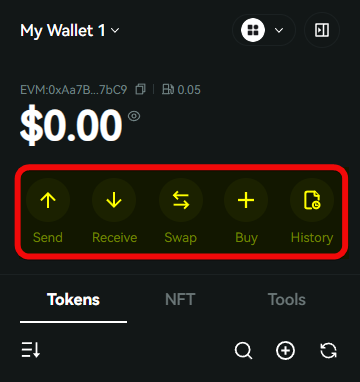 In the wallet, you can receive, send, swap funds, buy with a card, and view transaction history.