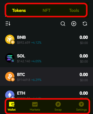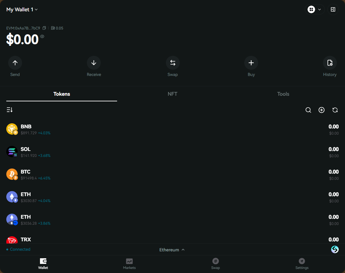 As you can see, in terms of security, after studying over a hundred different wallets, we note the absence of a number of important functions for internet-connected wallets (this is a hot wallet). Some available functions are located in the Tools tab.