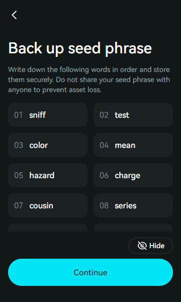 Enter the words from the seed phrase in the correct order, set an unlock code, and your wallet appears on the smartphone.