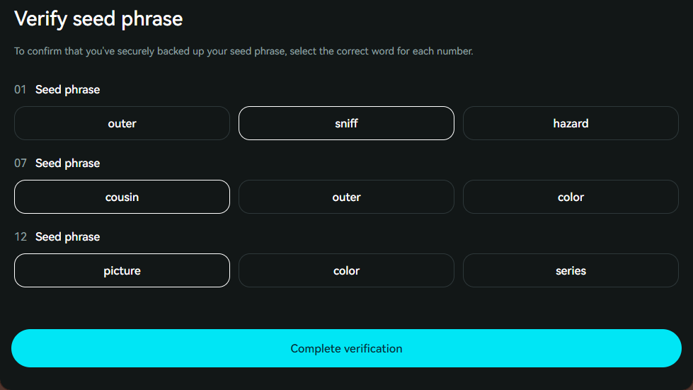 After writing down the phrase, the next window requires verification - you need to select the words with the specified numbers and click the Complete verification button.