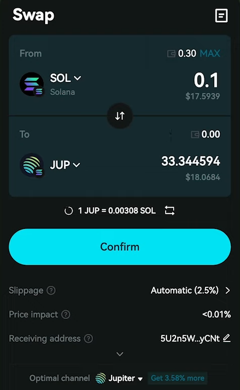 Swapping tokens is just as easy. Select 0.1 SOL, specify the target token, confirm the quote, and complete the deal.