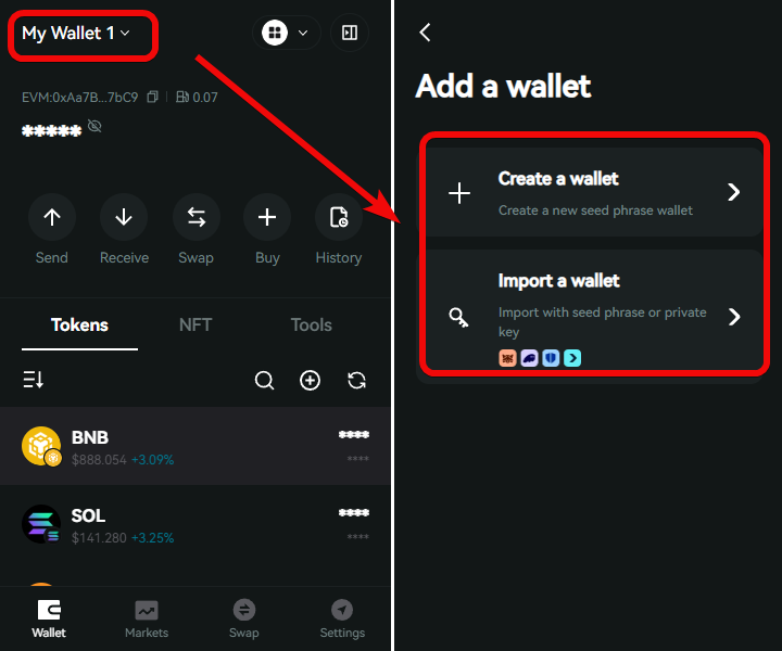 Important: when creating a wallet, you automatically receive addresses for different blockchains, including Bitcoin. In EVM networks (Ethereum, BSC, Arbitrum) the address is the same, but for Bitcoin, Tron, and other Layer 1 blockchains, the addresses are different.