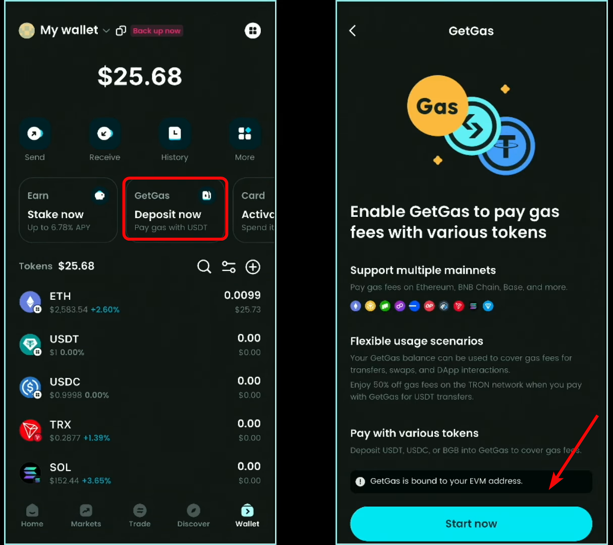The mobile app also has a GetGas option, allowing you to top up your account for fees via ETH, BGB, USDT, or USDC.